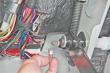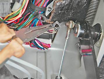 5. В салоне, под панелью приборов, плоскогубцами (с узкими губками) снимаем пружинную фиксирующую скобу наконечника троса.