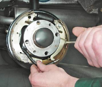 7. Отсоединяем наконечники тросов от уравнителя. 8. У тормозного механизма левого заднего колеса большой шлицевой отверткой сдвигаем распорный рычаг вперед и снимаем серьгу троса с крючка распорного рычага.