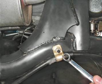9. Накидным ключом на 10 мм отворачиваем гайку кронштейна крепления троса к левому рычагу задней подвески.