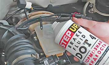 Уровень тормозной жидкости в бачке главного тормозного цилиндра - проверкаВнимание! Перед началом работы ознакомьтесь с правилами по технике безопасности при работе с тормозной жидкостью. Уровень тормозной жидкости проверяется периодически: во время эксплуатации автомобиля, при каждом техническом обслуживании, после проведения операций по прокачке гидропривода тормозной системы и замене тормозной жидкости, при загорании на щитке приборов контрольной лампы, сигнализирующей о недостаточном уровне тормозной жидкости в бачке главного тормозного цилиндра. Последовательность выполнения 1. Подготавливаем автомобиль к выполнению работы (см. "Подготовка автомобиля к техническому обслуживанию и ремонту"). 2. Ветошью удаляем грязь с бачка главного тормозного цилиндра. 3. Визуально проверяем уровень тормозной жидкости в бачке. Он должен находиться между отметками "MIN" и "МАХ" на корпусе бачка. 4. Проверяем степень износа накладок тормозных колодок передних и задних тормозных механизмов (см. "Тормозные колодки - проверка износа"). 5. Если износ колодок тормозных механизмов в пределах нормы, а уровень жидкости в бачке находится ниже метки "MIN", то отсоединяем наконечник жгута проводов от датчика аварийного падения уровня тормозной жидкости, отворачиваем и снимаем крышку бачка (см. "Датчик недостаточного уровня тормозной жидкости - проверка и замена"). Предупреждение! Для заполнения гидропривода тормозной системы используйте только новую жидкость. 6. Доливаем новую тормозную жидкость в бачок до метки "МАХ" (при установке крышки бачка поплавок датчика погрузится в жидкость и ее уровень повысится).