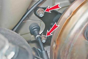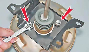 9. Ключом на 17 мм отворачиваем две гайки крепления кронштейна к вакуумному усилителю и снимаем кронштейн.