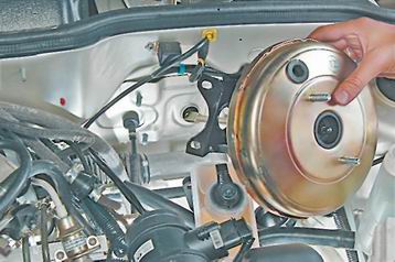 Вакуумный усилитель тормозов - снятие и установкаСнятие 1. Подготавливаем автомобиль к выполнению работы (см. "Подготовка автомобиля к техническому обслуживанию и ремонту"). 2. Отворачиваем две гайки крепления главного тормозного цилиндра к корпусу вакуумного усилителя (см. выше, "Главный тормозной цилиндр - снятие и установка"). 3. Осторожно, не изгибая сильно трубки, отводим цилиндр вперед и снимаем его со шпилек вакуумного усилителя.