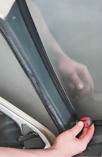 Ветровое стекло - заменаДля выполнения работы потребуется помощник, а также прочный шнур. 1. Подготавливаем автомобиль к выполнению работы (см. "Подготовка автомобиля к техническому обслуживанию и ремонту"). 2. Снимаем рычаги стеклоочистителей (см. "Очиститель ветрового стекла - снятие и установка"). 3. Снимаем внутренне зеркало заднего вида (см. "Внутреннее зеркало заднего вида - снятие и установка"). 4. Крестовой отверткой отворачиваем три самореза крепления накладки левой стойки кузова.