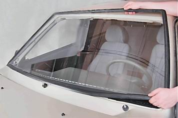 8. Снимаем со стекла уплотнитель. 9. Очищаем уплотнитель от грязи. 10. Стелим на капоте автомобиля чистый картон, бумагу или какой-нибудь другой не царапающий стекло материал. 11. Укладываем на него новое стекло наружной стороной вниз. 12. Одеваем на стекло по периметру уплотнитель.