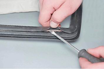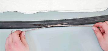 Совет: Чтобы стекло лучше "садилось" в проем, покрываем прорези уплотнителя или окантовку кузова мыльным раствором или силиконовой смазкой. 15. Укладываем стекло с уплотнителем в проем и центруем. Оно должно находиться точно в середине проема. Концы шнура выводим в салон. 16. Помощник снаружи прижимает стекло к кузову в местах вытягивания шнура. 17. В салоне поочередно тянем за концы шнура, перетаскивая край уплотнителя стекла через отбортовку проема. 18. Сначала переводим край уплотнителя по нижнему краю стекла и руками, надавив на его верхнюю кромку, максимально опускаем стекло вниз. Затем вытягиваем шнур по двум боковым сторонам, и в последнюю очередь - сверху стекла в направлении от краев к центру.