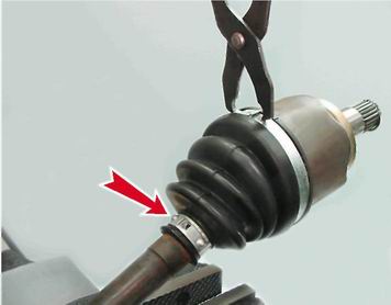 Внутренний шарнир привода - снятие, замена защитного чехла и установкаДля выполнения работы потребуются: - специальные клещи для установки хомутов крепления чехлов ШРУСов или раздвижные пассатижи; - съемник наружных стопорных колец; - смазка для ШРУСов - 80 см³; - новый защитный чехол шарнира; - новые стопорное и упорное кольца шарнира. Снятие 1. Снимаем привод в сборе (см. "Привод переднего колеса - снятие и установка"). 2. Закрепляем привод в сборе в тисках и специальными клещами или раздвижными пассатижами снимаем большой и малый хомуты защитного чехла.