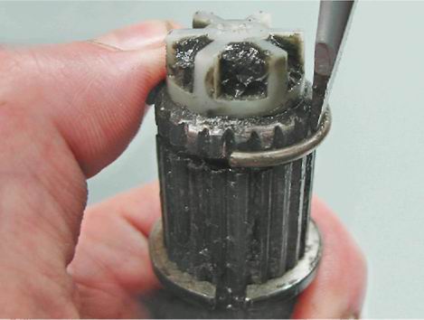 5. Снимаем стопорное и упорное кольца, аналогично тому, как это показано на наружном шарнире (см. "Наружный шарнир привода - снятие, замена защитного чехла и установка"). 6. Снимаем защитный чехол с вала привода. 7. Промываем шарнир в керосине, вытираем чистой тканью и даем высохнуть. Установка 1. Закрепляем в тисках вал привода в вертикальном положении. 2. Наматываем скотч (или изоляционную ленту) на шлицы вала, надеваем на вал новый защитный чехол, сдвигаем чехол к середине вала и удаляем скотч. Замечание: На правом приводе выворачиваем чехол наизнанку на вал. Совет: Не используйте для установки упорного кольца торцовую головку. Внутренняя фаска, имеющаяся почти на всех головках, сожмет кольцо, что не позволит установить его на вал. 3. Используя рожковый ключ на 24 мм как оправку, устанавливаем на шлицевой конец вала новое упорное кольцо.