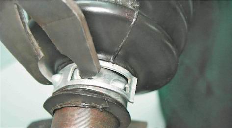 Предупреждение! Для внутреннего шарнира необходимо 80 см³ смазки. 7. Заполняем шарнир смазкой для ШРУСов, а оставшуюся часть смазки (от 80 см³) закладываем в защитный чехол. 8. Надеваем большой уплотнительный пояс защитного чехла на корпус шарнира, а малый уплотнительный пояс чехла устанавливаем в проточку вала. Приподняв малый уплотнительный пояс чехла при помощи тонкой шлицевой отвертки, выпускаем воздух из внутренней полости защитного чехла.