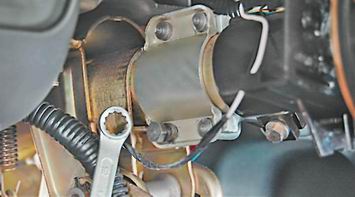 Установка 1. Перед установкой замка зажигания, вставляем в него ключ и поворачиваем его в положение I - "включено", чтобы защелка механизма блокировки рулевого вала была задвинута в корпус замка. 2. Устанавливаем замок зажигания со скобой крепления на рулевую колонку и от руки заворачиваем новые болты крепления. 3. Вынув ключ из замка зажигания, проверяем работу механизма блокировки рулевого вала. Если рулевой вал не фиксируется после полного оборота рулевого колеса, то отрегулируйте положение замка зажигания на рулевой колонке так, чтобы защелка замка могла войти в паз на рулевом валу. 4. Убедившись, что механизм блокировки работает, накидным ключом на 10 мм равномерно (крест-накрест, по пол-оборота) затягиваем болты до отрыва их головок.
