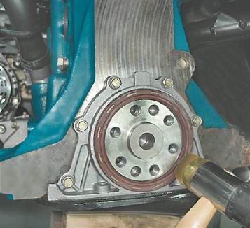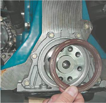 1. Наносим чистое моторное масло на рабочую кромку нового сальника и равномерно запрессовываем его до упора молотком с пластмассовым бойком.