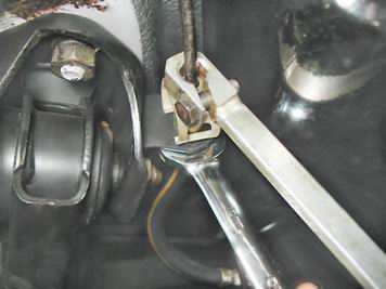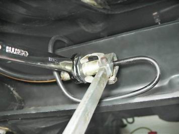 4. Окончательно выворачиваем штуцер рожковым ключом на 10 мм. 5. Для предотвращения утечки тормозной жидкости надеваем на конец тормозной трубки защитный колпачок штуцера прокачки рабочего цилиндра. 6. Выводим верхний наконечник тормозного шланга из отверстия кронштейна кузова. 7. Аналогичным образом отворачиваем трубку от нижнего наконечника тормозного шланга и освобождаем его, выводя из отверстия кронштейна, установленного на балке заднего моста.