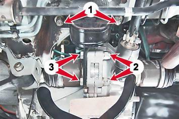 3. Торцовым ключом на 17 мм отворачиваем две гайки крепления опоры к кузову (1). На подставке опускаем на 10-15 мм заднюю часть силового агрегата. Ключом на 19 мм отворачиваем две гайки (2) болтов крепления кронштейна опоры к картеру коробки передач, удерживая болты (3) торцовым ключом того же размера.