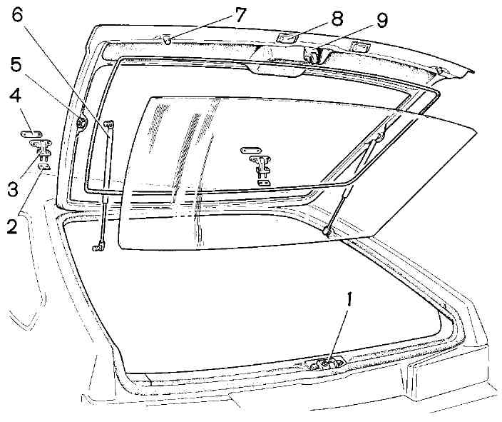 Рис. 9-47. Снятие двери задка: 1 - фиксатор двери задка; 2 и 4 - прокладки; 3 - петля; 5 - резьбовое отверстие; о - газонаполненный упор двери; 7 - буфер; 8 - фонарь освещения номерного знака; 9 - замокВ связи с изменением конструкции задка изменилась конструкция заднего пола, панелей боковин и крыши, заднего окна. Методы замены и ремонта этих узлов и деталей остаются теми же, что и для автомобиля ВАЗ-2115. Снятие и установка двери задка