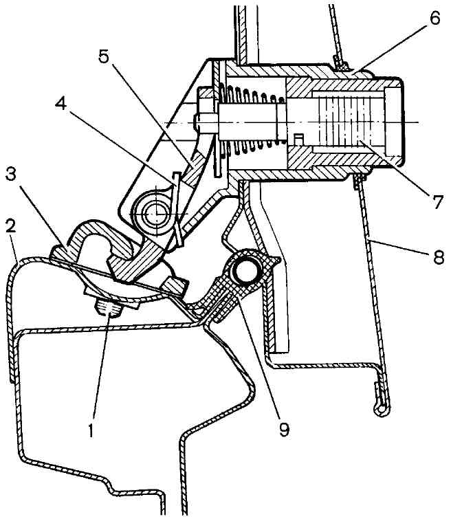 Рис. 9-49. Замок двери задка: 1 - болт крепления фиксатора; 2 - поперечина передка; 3 - фиксатор; 4 - пружина крючка; 5 - крючок; 6 - корпус замка; 7 - цилиндр привода замка; 8 - дверь задка; 9 - уплотнитель проема двериУстановку двери выполняйте в обратном порядке. При необходимости регулировки положения двери в проеме кузова ослабьте гайки неподвижных петель и, за счет увеличенных отверстий в кузове, отрегулируйте зазоры по периметру двери. По окончании регулировки заверните гайки. Если дверь задка закрывается слишком туго, то ослабьте крепление фиксатора 3 и, за счет увеличенных отверстий, сместите его в нужное положение. Перед регулировкой рекомендуется очертить контуры фиксатора на кузове. По окончании регулировки заверните болты его крепления. |