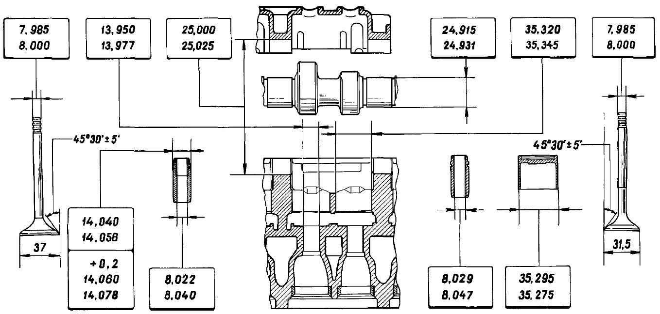 Головка цилиндровОСОБЕННОСТИ УСТРОЙСТВА Основные размеры головки цилиндров и деталей механизма привода клапанов даны на рис. 2-27.