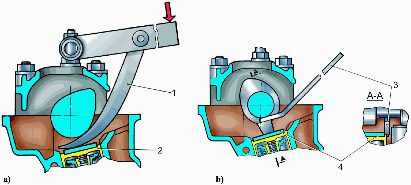 Рис. 2-29. Утапливание (а) и фиксирование (b) толкателей клапанов при замене регулировочной шайбы: 1 - приспособление 67.78(30.9503; 2 - толкатель; 3 - фиксатор 67.7800.9504; 4 - регулировочная шайбаЗазор регулируйте в следующем порядке: - снимите крышку головки цилиндров и переднюю защитную крышку зубчатого ремня; - выверните свечи зажигания ключом 67.7812.9515 и удалите масло из верхней части головки цилиндров; - осмотрите поверхность кулачков распределительного вала: на них не должно быть задиров, раковин, износа и глубоких рисок; - установите на шпильки крепления крышки головки цилиндров приспособление 67.7800.9503 для утапливания толкателей клапанов; - поверните коленчатый вал до совмещения установочных меток на шкиве и задней крышке зубчатого ремня, а затем доверните его еще на 40-50° (2,5-3 зуба на шкиве распределительного вала). При этом в первом цилиндре будет фаза сгорания; ПРЕДУПРЕЖДЕНИЕ. Поворачивать коленчатый вал следует только по часовой стрелке или за болт крепления шкива привода генератора, или за шкив распределительного вала с помощью приспособления 67.7811.9509. Нельзя поворачивать коленчатый вал за болт крепления шкива распределительного вала, так как при этом можно повредить болт. - проверьте набором щупов зазоры у 1-го и 3-го кулачков распределительного вала; - если зазор отличается от нормы, то приспособлением 67.7800.9503 (рис. 2-29, a) утопите толкатель и зафиксируйте его в нижнем положении, установив между краем толкателя и распределительным валом фиксатор 67.7800.9504 (рис. 2-29, b); - приспособлением 67.7800.9505 удалите регулировочную шайбу и микрометром измерьте ее толщину; - определите толщину новой шайбы по формуле: H = В + (А - С), где: А - замеренный зазор, мм; В - толщина снятой шайбы, мм; С - номинальный зазор, мм; H - толщина новой шайбы, мм. Пример. Допустим, А = 0,26 мм; В = 3,75 мм; С = 0,2 мм (для впускного клапана), тогда: H = 3,75 + (0,26 - 0,2) = 3,81 мм В пределах допуска на зазор +0,05 мм принимаем толщину новой шайбы равную 3,8 мм. - установите в толкатель клапана новую регулировочную шайбу, маркировкой в сторону толкателя, уберите фиксатор 67.7800.9504 и еще раз проверьте зазор. Если он отрегулирован верно, то щуп толщиной 0,2 или 0,35 мм должен входить с легким защемлением; - последовательно поворачивая коленчатый вал на пол-оборота, что соответствует повороту метки на шкиве распределительного вала на 90°, отрегулируйте зазоры у остальных клапанов, соблюдая очередность, указанную в таблице 2-2; Таблица 2-2. ПОРЯДОК РЕГУЛИРОВКИ ЗАЗОРОВ В МЕХАНИЗМЕ ПРИВОДА КЛАПАНОВ