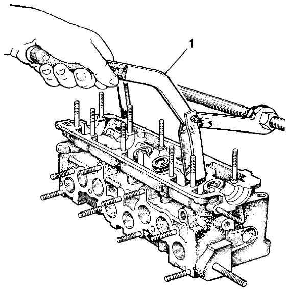 Рис. 2-33. Сжатие пружин клапанов: 1 - приспособление 67.7823.9505Сборка. Установите опорные шайбы пружин. Смажьте моторным маслом клапаны и новые маслоотражательные колпачки (старые использовать не допускается). Оправкой 41.7853.4016 напрессуйте на направляющие втулки колпачки. Вставьте клапаны в направляющие втулки, установите пружины и тарелки пружин. Сжимая пружины приспособлением 67.7823.9505, установите сухари клапанов. Вставьте в отверстия головки цилиндров толкатели клапанов с регулировочными шайбами. Очистите сопрягающиеся поверхности головки цилиндров и корпусов подшипников от остатков старой прокладки, грязи и масла. Поставьте установочные втулки (рис. 2-34) корпусов подшипников распределительного вала.