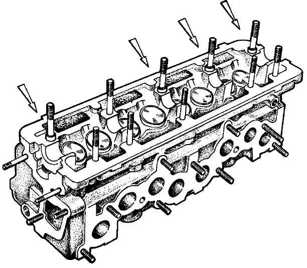 Рис. 2-36. Нанесение герметика на поверхность головки цилиндров Примечание. Запускать двигатель разрешается не ранее чем через 1 ч после нанесения герметика.Установите корпусы подшипников и затяните гайки их крепления в два приема: 1. Предварительно затяните гайки в последовательности, указанной на рис. 2-37, до прилегания поверхностей корпусов подшипников к головке цилиндров, следя за тем, чтобы установочные втулки корпусов свободно вошли в свои гнезда. 2. Окончательно затяните гайки моментом 21,6 Н·м (2,2 кгс·м) в той же последовательности.