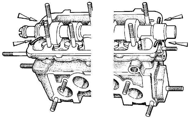 Рис. 2-35. Положение кулачков первого цилиндра при укладке распределительного вала в опоры головки цилиндров Смажьте моторным маслом опорные шейки и кулачки распределительного вала и уложите его в опоры головки цилиндров в таком положении, чтобы кулачки первого цилиндра были направлены вверх (рис. 2-35). На поверхности головки цилиндров, сопрягающиеся с корпусами подшипников, в зоне крайних опор распределительного вала нанесите герметик типа КЛТ-75ТМ или аналогичный ему герметик типа ТБ-1215 фирмы "Three Bond" (рис. 2-36).