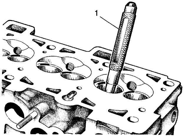 Рис. 2-39. Выпрессовка направляющих втулок оправкой A.60153/R: 1 - оправка A.60153/RЗапрессуйте направляющие втулки с надетым стопорным кольцом до упора его в тело головки цилиндров. После запрессовки разверните отверстия в направляющих втулках клапанов развертками А.90310/1 (для втулок впускных клапанов) и А,90310/2 (для втулок выпускных клапанов). Затем прошлифуйте седло клапана и, при необходимости, доведите ширину рабочей фаски до нужных размеров, как указано выше. Маслоотражательные колпачки направляющих втулок при ремонте двигателя всегда заменяйте новыми. Поврежденные маслоотражательные колпачки заменяйте на снятой головке цилиндров. Для напрессовки колпачков пользуйтесь оправкой 41.7853.4016. Клапаны. Удалите нагар с клапанов. Проверьте, не деформирован ли стержень и нет ли трещин на тарелке. Поврежденный клапан замените. Проверьте состояние рабочей фаски клапана. При мелких повреждениях ее можно прошлифовать, выдерживая угол фаски 45°30'+5'. При этом расстояние от нижней плоскости тарелки клапана до базовых диаметров (34 и 30,5 мм) должны быть в пределах 1,3-1,5 и 1,8-2,0 мм (рис. 2-40).