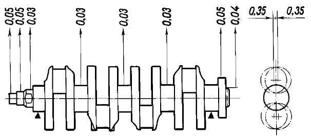 Рис. 2-23. Основные размеры коленчатого вала Коленчатый вал - литой, чугунный, пятиопорный. Предусмотрена возможность перешлифовки шеек коленчатого вала при ремонте с уменьшением диаметра на 0,25; 0,5; 0,75; и 1 мм.Осевое перемещение коленчатого вала ограничено двумя упорными полукольцами. Они вставляются в гнезда блока цилиндров по обе стороны среднего коренного подшипника, причем с задней стороны ставится металлокерамическое полукольцо (желтое), а с передней стороны - сталеалюминиевое. Полукольца изготавливаются двух размеров - нормального и увеличенного по толщине на 0,127 мм. Вкладыши подшипников коленчатого вала - тонкостенные, сталеалюминиевые. Верхние вкладыши 1, 2, 4 и 5 опор коленчатого вала с канавкой на внутренней поверхности, а нижние вкладыши - без канавки. Шатунные вкладыши (верхние и нижние) также без канавки. Ремонтные вкладыши изготавливаются увеличенной толщины под шейки коленчатого вала, уменьшенные на 0,25; 0,5; 0,75 и 1 мм. Маховик - чугунный, литой, с напрессованным стальным зубчатым ободом для пуска двигателя стартером. Центрируется маховик цилиндрическим выступом на фланце коленчатого вала. На задней плоскости маховика около зубчатого обода имеется установочная метка в виде конусной лунки. Она должна находиться против шатунной шейки четвертого цилиндра. ПРОВЕРКА ТЕХНИЧЕСКОГО СОСТОЯНИЯ И РЕМОНТ Коленчатый вал. Осмотрите коленчатый вал. Трещины в любом месте коленчатого вала не допускаются. На поверхностях, сопрягаемых с рабочими кромками сальников, не допускаются царапины, забоины и риски. Установите коленчатый вал крайними коренными шейками на две призмы (рис. 2-24) и проверьте индикатором биение: - коренных шеек и посадочной поверхности под ведущую шестерню масляного насоса (не более 0,03 мм); - посадочной поверхности под маховик (не более 0,04 мм); - посадочной поверхности под шкивы и поверхностей, сопрягающихся с сальниками (не более 0,05 мм).