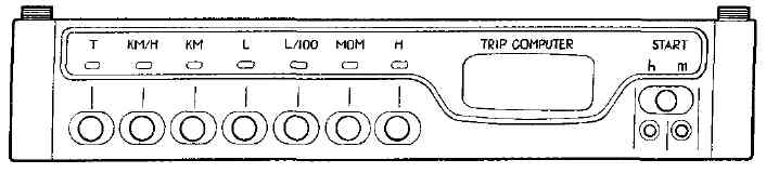 Рис. 1-5. Маршрутный компьютер Маршрутный компьютер (рис. 1-5) устанавливается на часть выпускаемых автомобилей и предназначен для измерения, накопления и выдачи на цифровой дисплей одного из семи параметров: - расхода топлива (текущего, среднего, суммарного); - средней скорости движения; - пройденного пути; - текущего времени; - времени в пути. При нажатии на кнопку "START" в начале поездки устанавливаются в "нуль" значения всех параметров, за исключением "текущего расхода топлива" и "текущего времени". Цифровой дисплей последовательно индицирует значения одного из семи параметров после нажатия на соответствующую кнопку управления. Текущее время (кнопка "Н") - индицируется в часах и минутах до значения 23 ч. 59 мин. Установка нового значения часов производится нажатием на кнопки "h" - часы и "m" - минуты, расположенные под кнопкой "START". При непрерывном нажатии на соответствующую кнопку происходит увеличение показаний часов или минут на две цифры в секунду. При нажатии на кнопку "START" происходит обнуление разрядов минут и секунд - привязка к радиосигналам точного времен Текущий расход топлива (кнопка "МОМ") - индицируется в л/100 км при скорости движения автомобиля более 10 км/ч или в л/ч при скорости автомобиля менее 10 км/ч. Средний расход топлива за поездку (кнопка "L/100") - индицируется в л/100 км с момента нажатия на кнопку "START". Суммарный расход топлива (кнопка "L") - индицируется в литрах с момента нажатия на кнопку "START" до значения 624,9 л. Пройденный путь (кнопка "КМ") - индицируется в километрах с момента нажатия на кнопку "START" до значения 999,9 км. Средняя скорость движения (кнопка "KM/H") - индицируется в км/ч с момента нажатия на кнопку "START", не включая остановки и стоянки с выключенным зажиганием. Время в пути (кнопка "Т") - индицируется в часах и минутах с момента нажатия на кнопку "START" до значения 99 час. 59 мин., не включая остановки и стоянки с выключенным зажиганием. ВНИМАНИЕ! При выключении зажигания отключается индикатор маршрутного компьютера, но накопленная информация и ход часов сохраняются. В случае отключения аккумуляторной батареи происходит потеря всей накопленной информации. При падении напряжения в бортсети не ниже 6 В накопленная информация и ход часов сохраняются. |