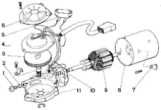 Рис. 7-24. Детали моторедуктора очистителя ветрового стекла: 1 - упорный винт; 2 - подпятник; 3 - шестерня редуктора; 4 - панель; 5 - термобиметаллический предохранитель; 6 - крышка; 7 - сухарь; 8 - корпус электродвигателя; 9 - якорь; 10 - щеткодержатель; 11 - корпус редуктораДля разборки моторедуктора отверните винты крепления крышки 6 (рис. 7-24) редуктора и снимите ее вместе с панелью 4 концевого выключателя. Затем отверните винты крепления корпуса 11 редуктора к корпусу 8 электродвигателя и разъедините их. Выньте якорь 9 электродвигателя. Чтобы снять шестерню 3 редуктора, отверните гайку крепления кривошипа, снимите стопорное кольцо с оси и выньте из корпуса ось с шестерней и шайбами. После разборки продуйте внутренние полости электродвигателя сжатым воздухом для удаления отложений угольной пыли и проверьте состояние щеток и коллектора. Щетки должны свободно, без заеданий перемещаться в щеткодержателях, а пружины должны быть целыми и иметь достаточную упругость. Коллектор зачистите мелкозернистой шлифовальной шкуркой, а затем протрите чистой тряпкой, слегка смазанной техническим вазелином. Если коллектор сильно обгорел или изношен, то моторедуктор лучше замените новым. Проверьте, нет ли следов заедания на шейках вала якоря. При необходимости зачистите их мелкозернистой шлифовальной шкуркой. При сборке отводите щетки от коллектора, чтобы не поломать их и не повредить их кромок, а якорь в корпус вставляйте с особой осторожностью, избегая ударов якоря о полюса, чтобы не разбить их. После сборки, для центровки подшипников, постучите деревянным молотком по корпусу моторедуктора, а затем проверьте его на стенде. При установке кривошипа располагайте его так, чтобы в конечном положении он был параллелен короткой тяге очистителя и был направлен в сторону электродвигателя. Данные для проверки моторедуктора