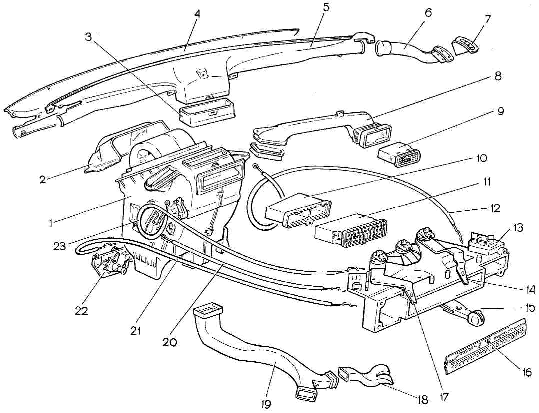 Рис. 8-31. Отопитель с воздухопроводами, соплами вентиляции и рычагами отопления: 1 - отопитель в сборе; 2 - кожух защитный; 3 - уплотнитель; 4 - воздухопровод передний; 5 - воздухопровод задний; 6 - воздухопровод правый; 7 - сопло правое; 8 - воздухопровод боковой правый; 9 - сопло боковое правое; 10 - корпус промежуточный; 11 - сопло центральное; 12 - тяга заслонки обогрева ветрового стекла; 13 - рычаги управления отопителем; 14 - рукоятка управления заслонкой обогрева ветрового стекла; 15 - рукоятка управления отопителем; 16 - пластина символов; 17 - рукоятка управления заслонкой обогрева ног; 18 - воздуховод правый; 19 - воздуховод обогрева салона; 20 - тяга заслонки управления отопителем; 21 - тяга управления краном отопителя; 22 - кран отопителя; 23 - тяга заслонки обогрева ногСнятие и установка отопителя Перед снятием отопителя отсоедините провод "массы" от аккумуляторной батареи и слейте охлаждающую жидкость из системы охлаждения. Снимите панель приборов (см. подраздел "Панель приборов") и облицовку туннеля пола, после чего отсоедините воздуховод 19 (рис. 8-31) обогрева салона. Отсоедините электрические провода от резистора 18 (рис. 8-32) и электродвигателя 2 вентилятора, подводящий 12 и отводящий 13 шланги крана отопителя. Отверните две гайки крепления крана на щитке передка и снимите уплотнитель труб крана. Открутите четыре гайки крепления отопителя к кузову и снимите отопитель с управлением в сборе.Установку отопителя производите в обратном порядке.