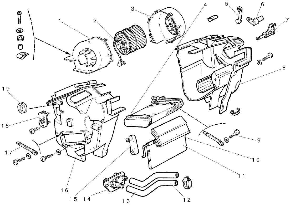 Рис. 8-32. Детали отопителя: 1 - левый кожух вентилятора; 2 - электродвигатель отопителя; 3 - правый кожух вентилятора; 4 - радиатор; 5 - тяга привода заслонки обогрева ветрового стекла; 6 - рычаг привода заслонки внутренний; 7 - рычаг привода заслонки наружный; 8 - правый кожух отопителя; 9 - винт; 10 - заслонка канала обдува ног; 11 - заслонка управления отопителем; 12 - подводящий шланг; 13 - отводящий шланг; 14 - кран отопителя; 15 - рычаг привода заслонки обогрева ног; 16 - левый кожух отопителя; 17 - хомут; 18 - резистор добавочный; 19 - кольцо уплотнительноеРазборка и сборка отопителя Перед разборкой отопителя снимите скобы с оболочек тяг 12 (рис. 8-31), 20, 21, 23 на кожухах отопителя и тяги с рычагов привода заслонок. Ослабьте хомуты крепления шлангов 12 и 13 (рис. 8-32) на кране 14 и радиаторе 4 отопителя и снимите шланги. Выверните три винта крепления радиатора и извлеките его из отопителя. Отсоедините резистор от кожуха отопителя. Разъедините кожухи 1 и 3, сняв предварительно скобы их крепления. Снимите вентилятор в сборе, открутив два винта крепления. Отсоедините опору 17 от кожуха 15 и выньте заслонку 11 управления отопителем. Примечание. Для избежания нарушения балансировки не допускается снимать рабочее колесо вентилятора с вала электродвигателя. Сборку отопителя выполняйте в обратном порядке. Перед сборкой осмотрите состояние кожухов отопителя, заслонки и уплотнителей. При необходимости уплотнители заслонок и уплотнитель воздухопровода ветрового стекла приклейте клеем 88 НП-35. Обратите внимание на правильность установки уплотнительных прокладок и на надежность затягивания стяжных хомутов шлангов. |
