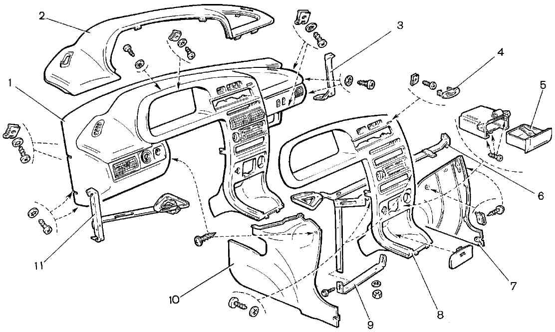 Рис. 8-27. Панель приборов и ее принадлежности: 1 - панель приборов; 2 - накладка панели приборов; 3 - кронштейн; 4 - заглушка; 5 - пепельница; 6 - поперечина правая; 7 - экран консоли правый; 8 - щиток панели приборов; 9 - кронштейн центральный; 10 - экран консоли левый; 11 - поперечина леваяСнятие и установка панели приборов Для снятия панели приборов отсоедините провод "массы" от аккумуляторной батареи. Выверните винты крепления и снимите облицовочный кожух вала рулевого управления и выключатель зажигания, отсоединив от него провода. Снимите рукоятки с рычагов управления отопителем и рукоятку гидрокорректора фар. Выкрутите винты и отсоедините от консоли щитка экраны - левый 10 и правый 7. Открутите винты крепления комбинации приборов к панели, крепления щитка к поперечине 6. Выньте декоративную заглушку 4 и выверните винт крепления щитка к панели приборов. Снимите щиток панели приборов в сборе с прикуривателем, выключателями освещения приборов, аварийной сигнализации, противотуманных фонарей и обогрева заднего стекла. Отсоедините электрические провода. Снимите панель приборов 1 в сборе с накладкой 2, вывернув четыре винта крепления ее к кронштейнам 3 и 11. При необходимости выверните винты и снимите накладку панели приборов, а также воздухопроводы и сопла отопления и вентиляции салона. Установку панели приборов производите в обратном порядке. Снятие и установка сидений Устройство передних сидений показано на рисунках 8-28, 8-29 и 8-30.