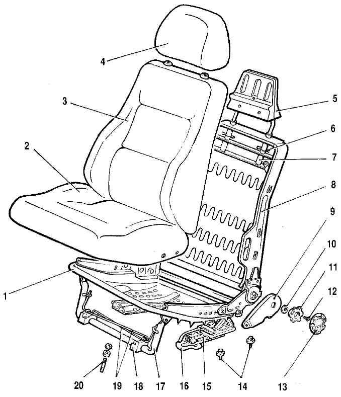 Рис. 8-28. Переднее сиденье: 1 - основание подушки; 2 - подушка; 3 - спинка; 4 - подголовник; 5 - каркас подголовника; 6 - шплинт; 7 - направляющая подголовника; 8 - основание спинки; 9 - облицовка механизма регулирования наклона спинки; 10 - прокладка; 11 - держатель ручки механизма регулирования наклона спинки; 12 - болт крепления держателя; 13 - ручка механизма регулирования наклона спинки; 14 - болты крепления салазок; 15 - направляющая салазок; 16 - ручка механизма передвижения; 17 - стойка основания; 18 - передний кронштейн; 19 - торсионы; 20 - шпилька крепления кронштейна