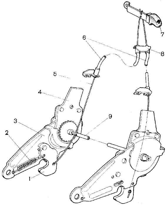 Рис. 8-30. Механизмы регулирования наклона спинки и откидывания спинки переднего сиденья: 1 - крючок; 2 - пружина крючка; 3 - нижнее звено механизма регулирования наклона спинки; 4 - верхнее звено механизма регулирования наклона спинки; 5 - тяга механизма откидывания спинки; 6 - оболочки тяг; 7 - ручка рычага механизма откидывания спинки; 8 - кронштейн; 9 - синхронизаторПередние сиденья. Для снятия сиденья передвиньте его в крайнее переднее положение и снимите торсионы 19 (см. рис. 8-28). Сдвиньте сиденье в крайнее заднее положение, отверните гайки шпилек 20 крепления кронштейнов 18 и снимите кронштейны. Поднимите сиденье за переднюю часть и выверните передние болты 14 крепления салазок к кузову. Затем передвиньте сиденье без перекосов до отказа вперед, выверните задние болты крепления салазок и снимите сиденье в сборе с салазками. Установку сиденья выполняйте в обратном порядке. Заднее сиденье. Выверните два болта крепления петель подушки и выньте ее из салона. Передвиньте рукоятку привода замков спинки вправо (если смотреть по ходу автомобиля) и освободите спинку сиденья. Выверните два болта крепления петель и снимите спинку в сборе с ковром багажного отделения. Устанавливайте заднее сиденье в обратном порядке. |