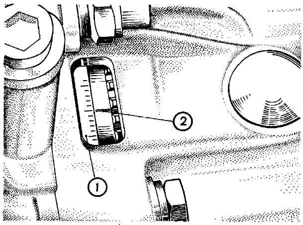 Рис. 2-45. Метки для определения в.м.т. поршней первого и четвертого цилиндров РЕГУЛИРОВКА НАТЯЖЕНИЯ РЕМНЯ ПРИВОДА РАСПРЕДЕЛИТЕЛЬНОГО ВАЛА Натяжение ремня регулируйте в следующем порядке: - снимите переднюю крышку зубчатого ремня; - поверните коленчатый вал за болт крепления шкива привода генератора по часовой стрелке в такое положение, чтобы метка на маховике (рис. 2-45), видимая в люке картера сцепления, находилась против среднего деления шкалы. При этом метка В (см. рис. 2-44) на шкиве распределительного вала должна находиться против установочной метки А на задней защитной крышке зубчатого ремня; - поверните коленчатый вал за болт крепления шкива привода генератора против часовой стрелки в такое положение, чтобы метка В на шкиве распределительного вала переместилась вниз от метки А на два зуба; - проверьте натяжение ремня: оно считается нормальным, если в средней части ветви между шкивами распределительного и коленчатого валов ремень закручивается на 90° усилием пальцев 15-20 H (1,5-2 кгс). Для проверки натяжения можно пользоваться приспособлениями 67.7834.9525 или 67.7834.9526 с тарированной пружиной; - если усилие ниже (выше) нормы, поверните коленчатый вал по часовой стрелке до совмещения меток А и В, ослабьте гайку крепления натяжного ролика, поверните его на 10-15° против (или по) часовой стрелки и затяните гайку крепления оси; - снова проверните коленчатый вал по часовой стрелке на два оборота до совмещения меток А и В, затем против часовой стрелки до смещения метки В на шкиве распределительного вала на два зуба вниз от метки А и проверьте натяжение ремня; - если натяжение недостаточно, то повторите операции по натяжению ремня; - если натяжение нормальное, то затяните гайку крепления натяжного ролика моментом 39,2 Н·м (4 кгс·м) и установите переднюю защитную крышку зубчатого ремня. Избегайте излишнего натяжения ремня, так как это значительно снижает срок его службы, а также подшипников насоса охлаждающей жидкости и натяжного ролика. После завершения регулировок проверьте затяжку болта крепления шкива привода генератора на коленчатом валу моментом 102,9 Н·м (10,5 кгс·м). ПРЕДУПРЕЖДЕНИЕ. При натяжении ремня не допускается проворачивать коленчатый вал вращением шкива распределительного вала. ЗАМЕНА РЕМНЯ ПРИВОДА РАСПРЕДЕЛИТЕЛЬНОГО ВАЛА Затормозите автомобиль рычагом привода стояночной тормозной системы и включите 4 или 5 передачу в коробке передач. Снимите переднюю защитную крышку зубчатого ремня. Ослабьте ремень привода генератора и снимите его со шкивов. Снимите шкив привода генератора с коленчатого вала и заверните на место болт крепления шкива. Установите рычаг коробки передач в нейтральное положение и поверните коленчатый вал по часовой стрелке в такое положение, чтобы метка на маховике (см. рис. 2-45), видимая в люке кожуха сцепления, находилась против среднего деления шкалы. При этом метка В (см. рис. 2-44) на шкиве распределительного вала должна находиться против установочной метки А на задней защитной крышке. Ослабьте гайку крепления натяжного ролика 3 и поверните его в такое положение, при котором ремень будет максимально ослаблен. Снимите ремень привода распределительного вала со шкивов. Наденьте зубчатый ремень на шкив 5 распределительного вала и, натягивая обе ветви ремня, заведите левую ветвь за натяжной ролик и наденьте ее на шкив 2 на