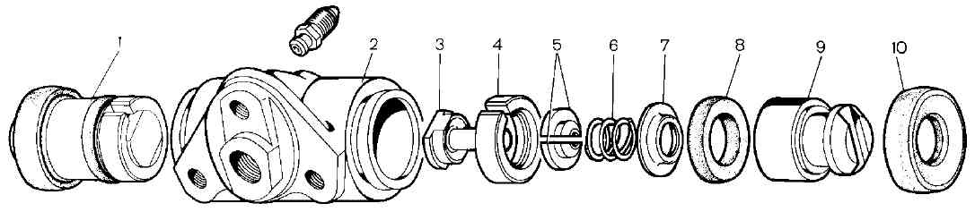 Рис. 6-27. Детали колесного цилиндра: 1 - поршень в сборе; 2 - корпус цилиндра; 3 - упорный винт; 4 - упорное кольцо; 5 - сухари; 6 - пружина; 7 - опорная чашка; 8 - уплотнитель; 9 - поршень; 10 - защитный колпачокСборку автоматического устройства и самого цилиндра проводите в обратной последовательности с учетом следующего: - перед установкой деталей обильно смажьте их тормозной жидкостью; - упорные винты поршней затягивайте моментом 3,9-6,9 Н·м (0,4-0,7 кгс·м); - прорезь "А" (см. рис. 6-8) на упорных кольцах должна быть направлена вертикально вверх: отклонение от вертикали допускается не более 30°. Такое расположение прорези обеспечивает полное удаление воздуха из привода тормозного механизма колеса при прокачке тормоза; - поршни в корпусе цилиндра запрессовывайте при помощи приспособления 67.7823.9532; - усилие запрессовки поршня в цилиндр должно быть не менее 345 H (35 кгс); при меньшем усилии замените упорное кольцо; - при запрессовке поршня в цилиндр необходимо выдержать размер 4,5-4,8 мм и 67 мм (максимально) (см. рис. 6-8) для свободной посадки тормозного барабана; - после сборки проверьте перемещение каждого поршня в корпусе цилиндра. Они должны легко перемещаться в пределах 1,25-1,65 мм. Последними установите на место защитные колпачки 2. Проверка деталей Колесные цилиндры. Проверьте чистоту рабочих поверхностей цилиндра, поршней и упорных колец. Поверхности должны быть совершенно гладкими, чтобы не происходило утечки жидкости и преждевременного износа уплотнителей и поршней. Дефекты на зеркале цилиндра устраните притиркой или шлифовкой. Однако при этом увеличение внутреннего диаметра цилиндра не допускается. Проверьте состояние упорного винта 3 (см. рис. 6-27), пружины 6, опорной чашки 7 и сухарей 5. При необходимости замените поврежденные детали новыми. Замените уплотнители 8 новыми. Проверьте состояние защитных колпачков 10 и при необходимости замените их. Колодки. Внимательно проверьте, нет ли на колодках повреждений или деформаций. Проверьте упругость стяжных и направляющих пружин колодок, при необходимости замените их новыми. Стяжные пружины не должны иметь остаточных деформаций при растяжении нижних пружин усилием 137,2 H (14 кгс) и верхних - 294 H (30 кгс). Проверьте чистоту накладок, если обнаружены грязь или следы смазки, накладки тщательно очистите металлической щеткой и промойте уайт-спиритом, кроме того, проверьте, нет ли утечки смазки внутри барабана; обнаруженные неисправности устраните. Колодки заменяйте новыми, если толщина накладок стала менее 1,5 мм. Замену проводите одновременно на обоих тормозных механизмах, то есть обе пары колодок. Тормозные барабаны. Осмотрите тормозные барабаны. Если на рабочей поверхности имеются глубокие риски или чрезмерная овальность, то расточите барабаны на станке. Затем также на станке абразивными мелкозернистыми брусками прошлифуйте барабаны. Это увеличивает долговечность накладок и улучшает равномерность и эффективность торможения. Увеличение диаметра барабана (200 мм) после расточки и шлифовки допускается до 201 мм. Предельно допустимый диаметр барабана 201,5 мм. Эти требования должны строго соблюдаться, в противном случае нарушается прочность барабана, а также эффективность торможения. |