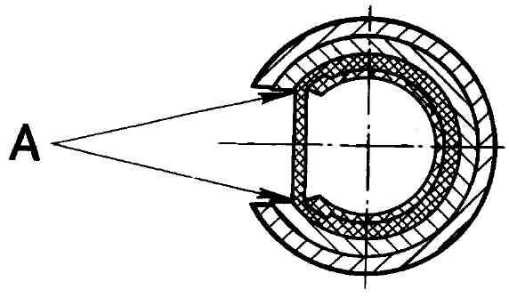 Рис. 5-5. Установка опорной втулки рейки: А - места разреза уплотнительного кольца после установки втулки в картер рулевого механизма.Запрессуйте под прессом оправкой 67.7853.9585 роликовый подшипник в картер рулевого механизма. Глубина запрессовки 37,5-0,2 мм (рис. 5-6), под усилием от 800 H (81,55 кгс) до 6000 H (611,6 кгс). Чтобы не повредить подшипник при запрессовке, применяемая оправка должна иметь упор, ограничивающий глубину запрессовки. Обильно смазав зубья рейки смазкой ФИОЛ-1, а другие ее поверхности тонким слоем этой же смазки, установите рейку в картер 2, продвинув ее через опорную втулку 11 до упора в специальное приспособление, чтобы выдержать размер 87+0,25 мм от торца рейки до оси упора рейки. Нанесите на зубья приводной шестерни и заложите в шариковый подшипник смазку ФИОЛ-1 до появления ее на верхнем торце подшипника. Затем установите шестерню в картер таким образом, чтобы лыска на ее валу была обращена вправо (по ходу автомобиля) и запрессуйте подшипник в картер до упора. Максимальное усилие запрессовки подшипника 1500 H (152,9 кгс).Общее количество смазки для рейки, приводной шестерни и подшипника должно быть 20-30 г. Ключом 67.7812.9536 затяните гайку приводной шестерни моментом 50+5 Н·м (5+0,5 кгс·м), установите стопорное кольцо 11 (см. рис. 5-4) и заполните полость над гайкой смазкой УНИОЛ-1. Установите приводную шестерню в положение прямолинейного движения автомобиля (определяется размером 87+0,25 мм) (см. рис. 5-6).