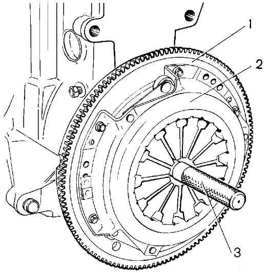Рис. 3-3. Центрирование ведомого диска: 1 - маховик; 2 - сцепление в сборе; 3 - оправка А.70081Проверка технического состояния и контроль сцепления Проверка состояния ведущей части сцепления. Закрепите нажимный диск 3 (рис. 3-4) в сборе с нажимной пружиной 1 и кожухом 2 на приспособлении с промежуточным кольцом 4, толщиной В = 8,3+0,025 мм. Это приспособление заменяет маховик с ведомым диском.