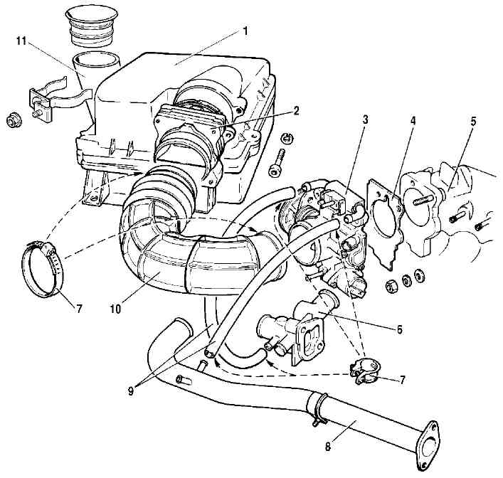 Рис. 2-3. Снятие узлов и деталей системы подачи воздуха: 1 - воздушный фильтр; 2 - датчик массового расхода воздуха; 3 - дроссельный патрубок; 4 - уплотнительная прокладка; 5 - ресивер; 6 - выпускной патрубок системы охлаждения двигателя; 7 - хомуты крепления шлангов; 8 - подводящая труба насоса охлаждающей жидкости; 9 - шланги подогрева дроссельного патрубка; 10 - шланг впускной трубы; 11 - шланг забора воздухаОткрутите гайку и отсоедините шланг 11 забора воздуха вместе с кронштейном. Снимите воздушный фильтр 1 с датчиком 2 массового расхода воздуха, срезав ножом три резиновые опоры, которыми фильтр крепится к кузову. Отсоедините от ресивера шланги отбора разрежения к регулятору давления топлива и к вакуумному усилителю тормозов. Отсоедините шланг продувки адсорбера от дроссельного патрубка (если на автомобиле имеется система улавливания паров бензина). Отсоедините провода от дроссельного патрубка, модуля зажигания, от жгута проводов форсунок, от стартера и генератора, от всех датчиков, имеющихся на силовом агрегате, и от выключателя света заднего хода на коробке передач. Поднимите автомобиль на подъемнике и снимите брызговик двигателя, отвернув болты его крепления к кузову. Слейте охлаждающую жидкость, отвернув сливные пробки блока цилиндров и радиатора при снятой крышке расширительного бачка и открытом кране отопителя.