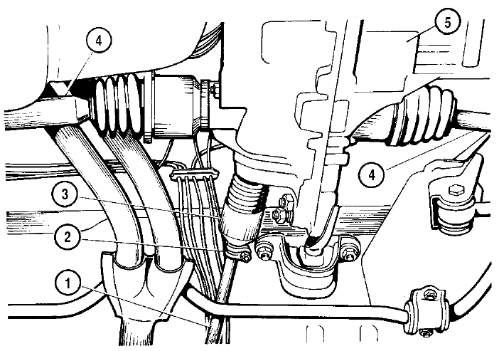 Рис. 2-5. Вид снизу на коробку передач: 1 - тяга привода рычага переключения передач; 2 - хомут; 3 - шарнир штока выбора передач; 4 - валы привода передних колес; 5 - коробка передачСлейте масло из коробки передач, отвернув сливную пробку. Отсоедините шланги от патрубка головки цилиндров и термостата. Отсоедините от коробки передач трос привода сцепления. Если двигатель снимается с помощью тали, то зацепите двигатель за рымы (рис. 2-4), установленные на головке цилиндров и коробке передач. Поднимите автомобиль на подъемнике, одновременно подтягивая цепь тали, чтобы силовой агрегат оставался подвешенным на тали. Отсоедините тягу 1 (рис. 2-5) привода рычага переключения передач от шарнира 3 штока выбора передач, отвернув болт хомута 2. Отверните и снимите болты (с коническими пружинами), стягивающие фланцы приемной трубы и нейтрализатора. Выньте уплотнительное кольцо, находящееся между фланцами труб, и отсоедините приемную трубу глушителей от нейтрализатора. Отверните болты крепления к кузову кронштейнов 30 (см. рис. 4-1) растяжек 29 рычагов передней подвески, ослабьте гайки крепления растяжек к рычагам 22 подвески и поверните растяжки в такое положение, чтобы они не мешали снятию силового агрегата. Отсоедините шаровые шарниры 21 рычагов подвески от поворотных кулаков.Выньте из полуосевых шестерен коробки передач наконечники внутренних шарниров валов 4 (см. рис. 2-5) привода передних колес и отведите валы в сторону. Вынимать можно съемником 67.7801.9524, или резко ударяя молотком через выколотку по корпусу внутреннего шарнира. Отсоединив один из валов, зафиксируйте полуосевую шестерню технологической оправкой или заглушкой, чтобы она не выпала в картер коробки передач. После отсоединения второго вала также закройте отверстие заглушкой. Если силовой агрегат снимается с помощью специальной тележки с гидроподъемником, то подведите ее под автомобиль и поднимите опорные кронштейны гидроподъемника до упора в силовой агрегат. Отверните болты крепления опор подвески силового агрегата к кузову (рис. 2-6) и опустите силовой агрегат гидроподъемником вниз. Если применяется таль, то перемещая цепь тали, осторожно опустите силовой агрегат на тележку.