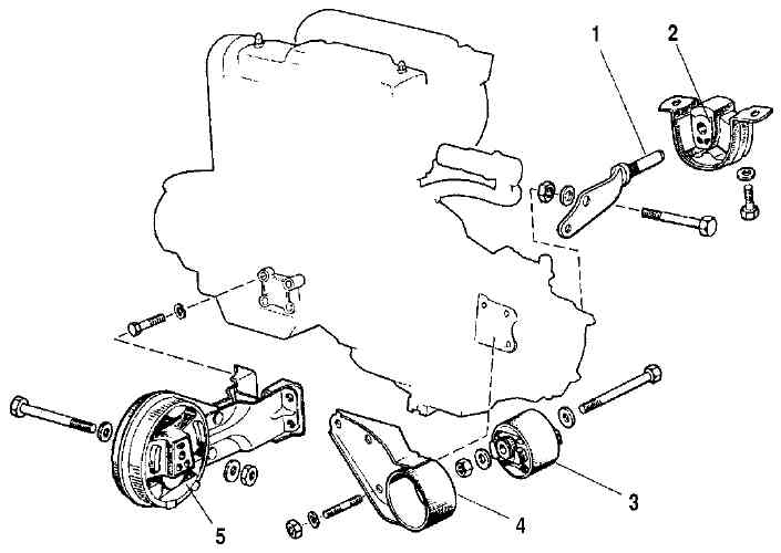 Рис. 2-6. Подвеска силового агрегата: 1 - кронштейн задней подвески; 2 - опора задней подвески; 3 - опора левой подвески; 4 - кронштейн левой подвески; 5 - кронштейн с опорой передней подвескиУстанавливайте силовой агрегат в порядке, обратном снятию. ПРЕДУПРЕЖДЕНИЕ. Перед соединением валов привода передних колес с коробкой передач установите новые стопорные кольца на наконечники внутренних шарниров. Повторное использование стопорных колец недопустимо, так как это может привести к самопроизвольному отсоединению валов от коробки передач при движении автомобиля. Резиновые опоры крепления воздушного фильтра одноразового использования. Поэтому при установке воздушного фильтра устанавливайте новые опоры. После установки силового агрегата отрегулируйте привод акселератора. При полностью отпущенной педали привода акселератора дроссельная заслонка должна быть полностью закрыта. Трос привода должен быть натянут. Прогиб троса от усилия руки должен быть не более 10 мм. При необходимости натяжение троса привода отрегулируйте регулировочными гайками наконечника троса. При полностью нажатой педали акселератора до упора дроссельная заслонка должна быть полностью открыта, сектор дроссельной заслонки не должен иметь дополнительного хода. При необходимости дополнительный ход устраните подгибанием упора педали в салоне автомобиля. Привод выключения сцепления отрегулируйте согласно указаниям подраздела "Сцепление". Проверьте и отрегулируйте углы установки передних колес (см. подраздел "Передняя подвеска"). Проверьте работу системы управления двигателем, как указано в "Руководстве по техническому обслуживанию и ремонту системы управления двигателем с распределенным впрыском топлива". |